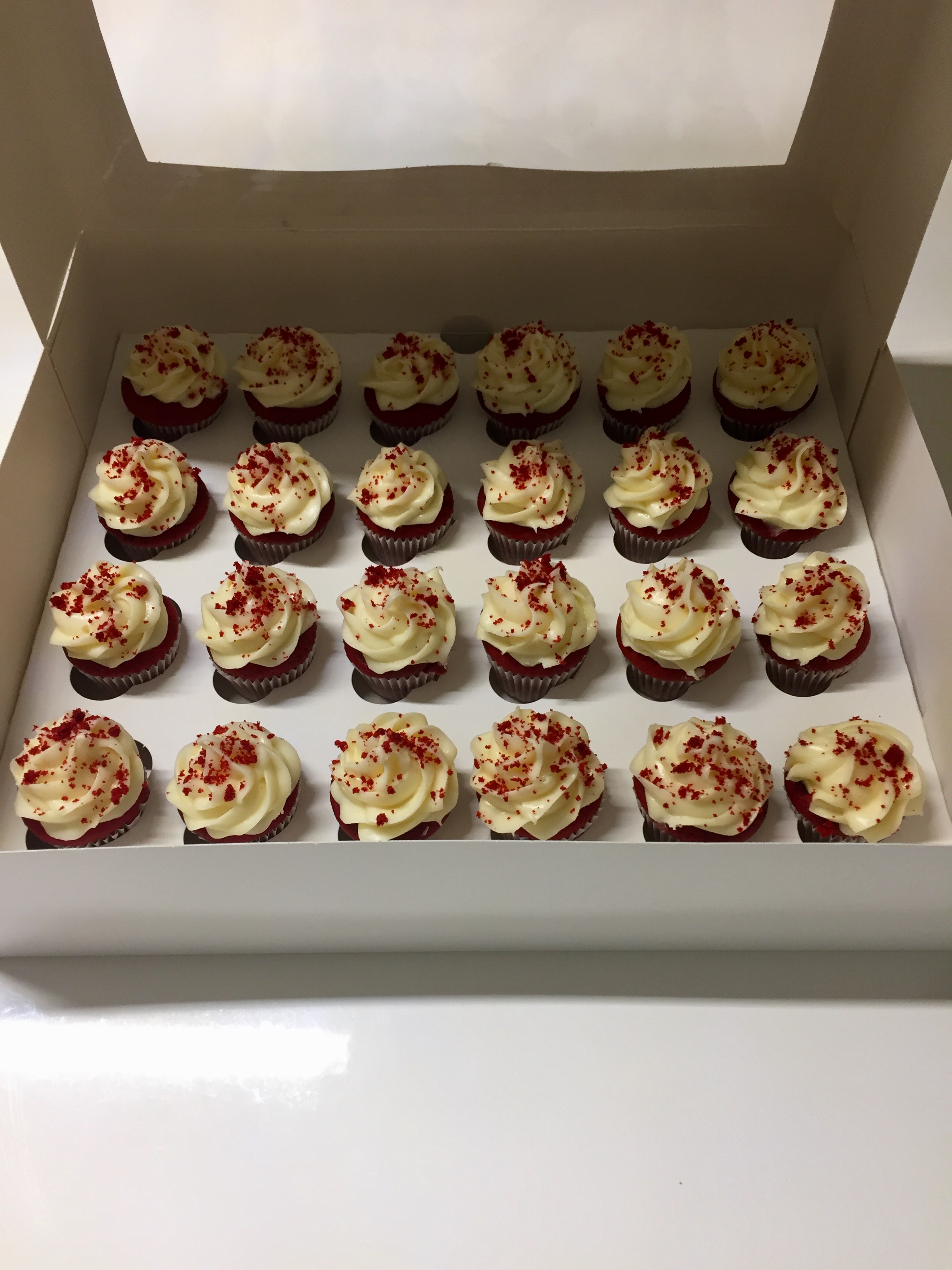 24. X Hand Crafted Red Velvet Mini Cup Cakes topped with a Cream Cheese Frosting and decorated with Red sprinkles