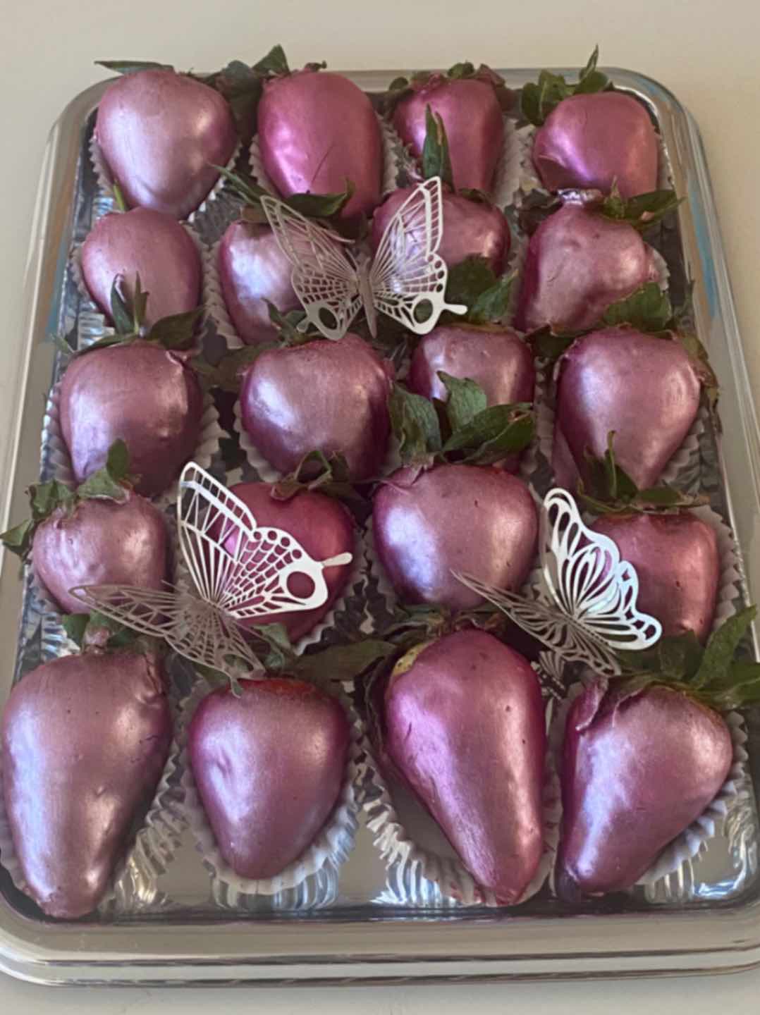 20x Fresh Sweet Strawberries dipped in Rich Dark Chocolate drizzled with white Chocolate. Served on a disposable silver platter with clipped lid