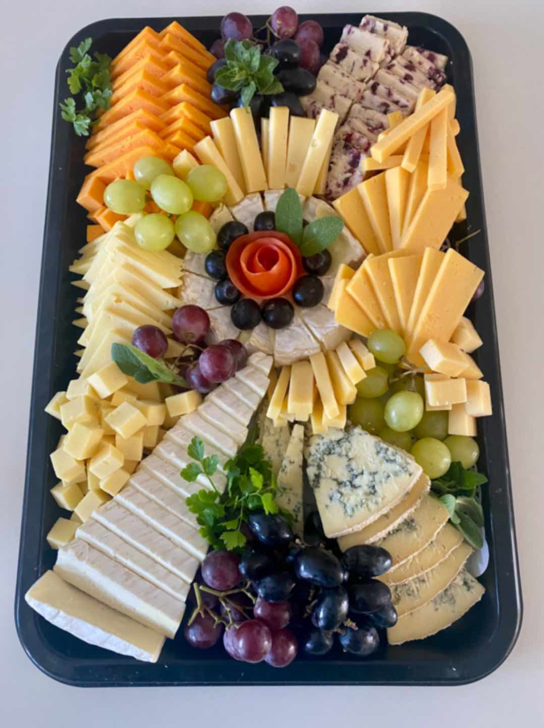 An elegant selection of premium cheeses beautifully arranged and garnished with fresh grapes and herbs.includes a variety of favourites such as: